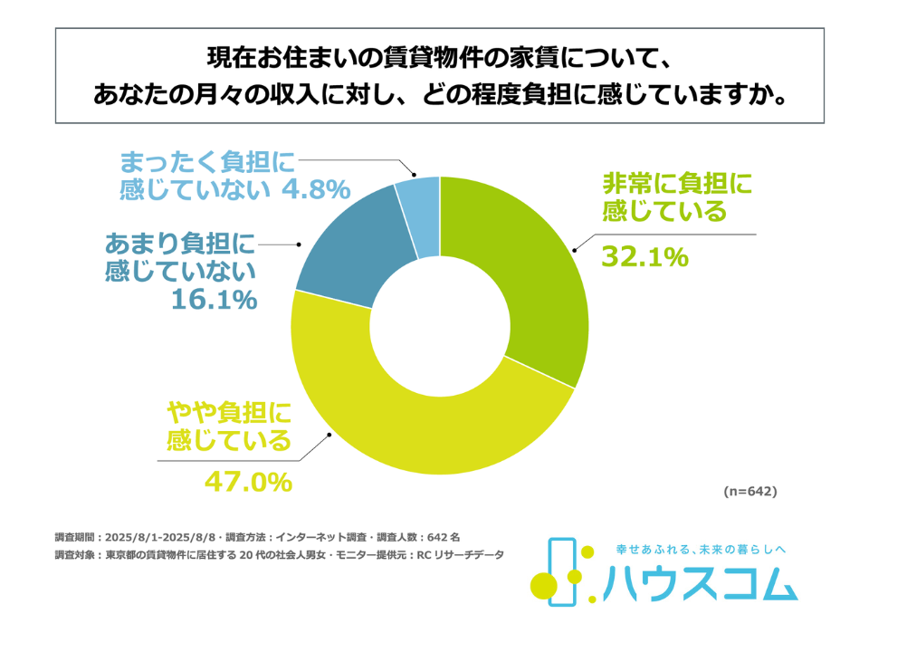 東京都の賃貸物件に居住する20代の社会人の約8割が、月収に対して、現在の家賃に負担を感じている。ハウスコム株式会社が「賃料高騰下における、東京都の20代の住まい選びに関する実態調査」を実施。