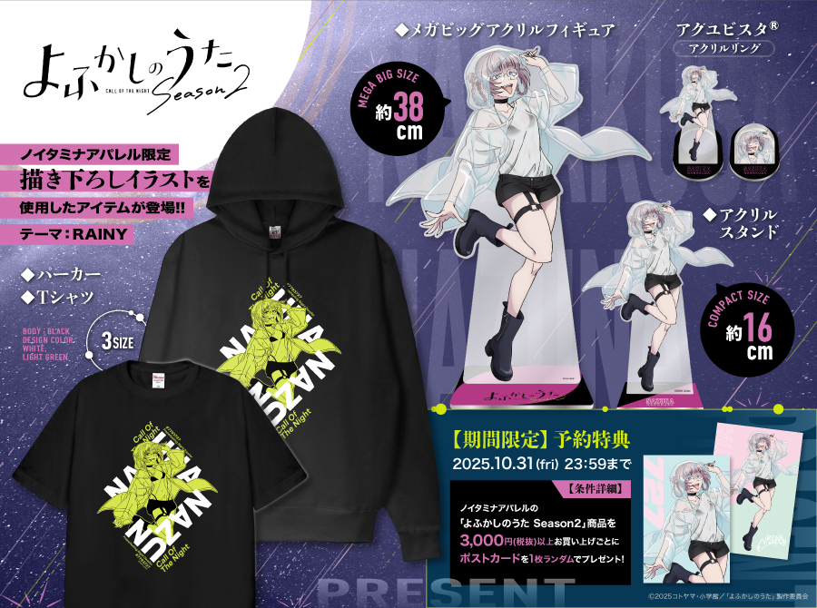 TVアニメ『よふかしのうた Season2』より、Rainyをテーマにしたノイタミナアパレル限定描き下ろしイラストを使用した、アパレルやアクリルグッズが新登場!