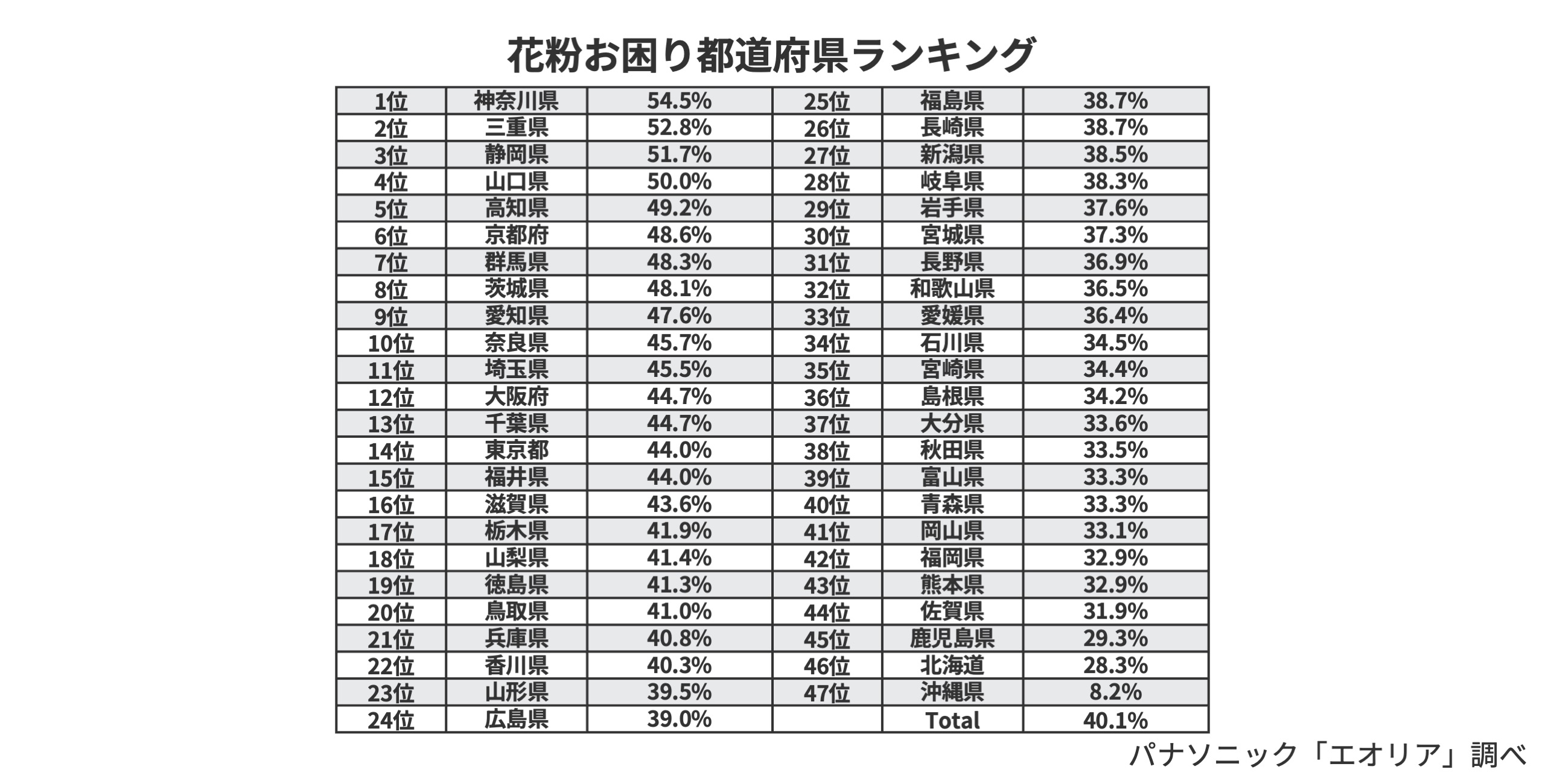 上位は2人に1人が花粉にお困り?花粉お困り都道府県ランキングを発表。パナソニック エアーマイスターが教える室内の花粉対策とエアコンと空気清浄機の「併用」テクニックも