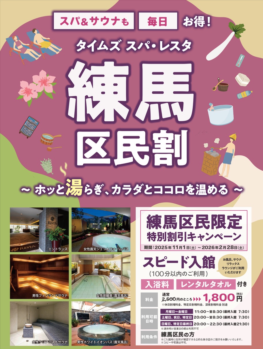東京・池袋 都心の大人のスパ施設「タイムズ スパ・レスタ」「練馬区民割」「文京区民割」キャンペーンを開催