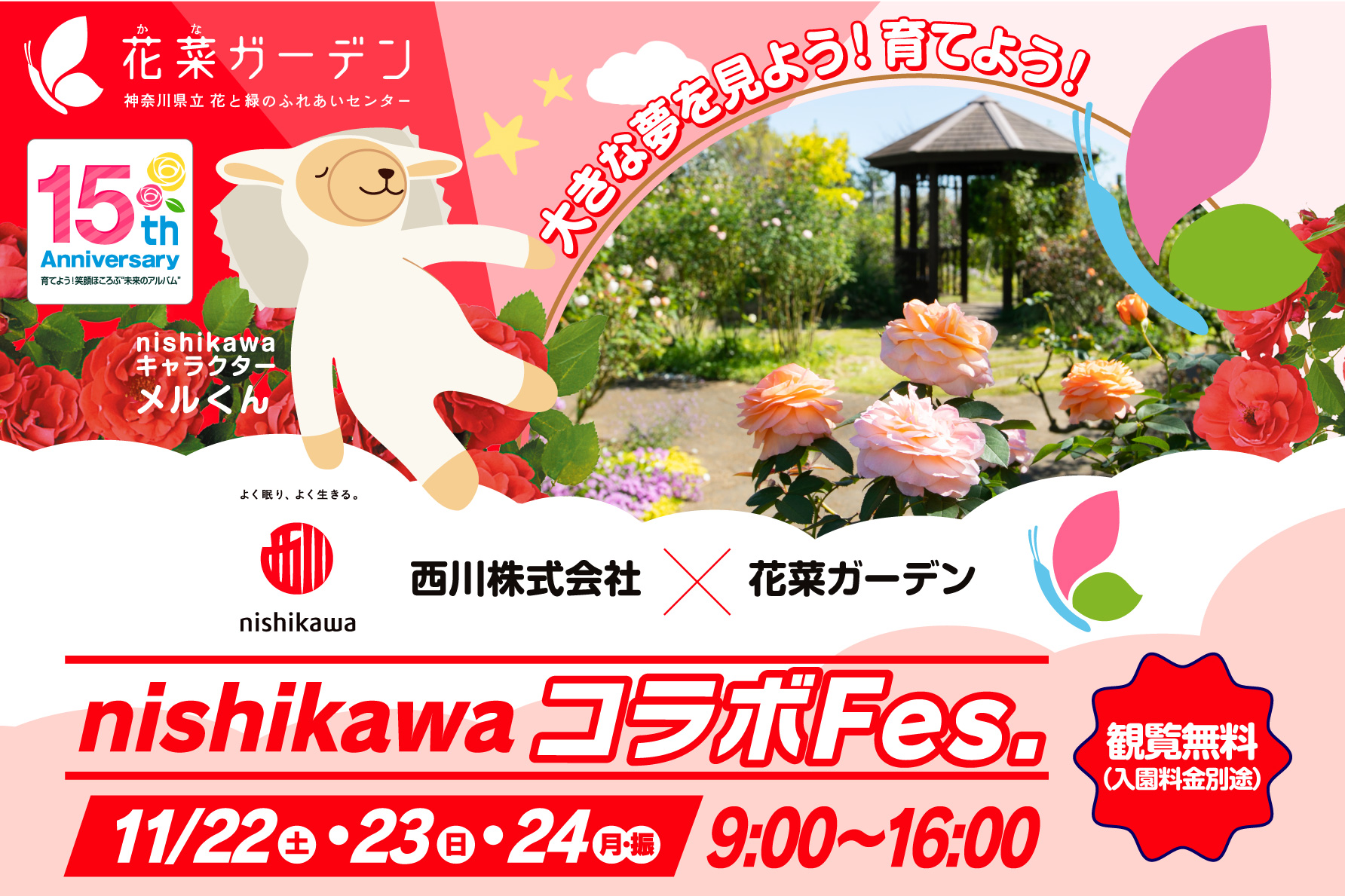 西川株式会社 × 花菜ガーデン。2025年11月22日(土)~24日(月・振)の3日間、神奈川県立 花と緑のふれあいセンター『花菜ガーデン』で〈nishikawaコラボFes.〉を開催!