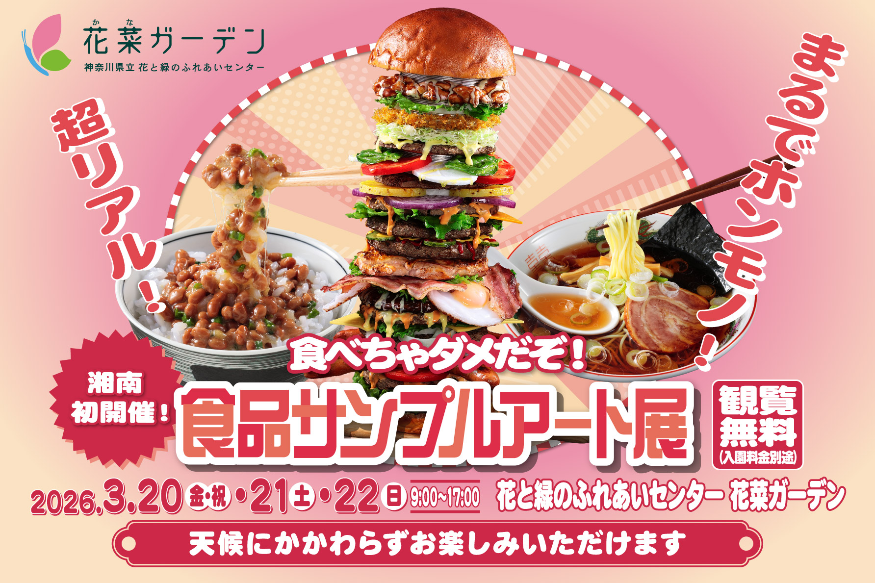 湘南初開催!2026年3月20日(金・祝)~22日(日)の3日間、神奈川県立 花と緑のふれあいセンター『花菜ガーデン』で〈食べちゃダメだぞ!食品サンプルアート展〉を開催。