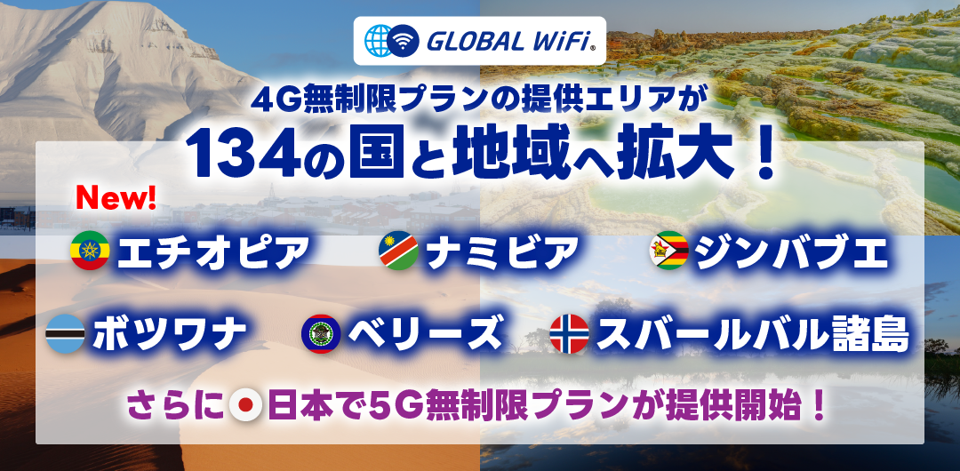 「グローバルWiFi(R)」4G無制限プランの提供エリアが134の国・地域へ拡大!さらに、日本での5G無制限プランの提供も開始。