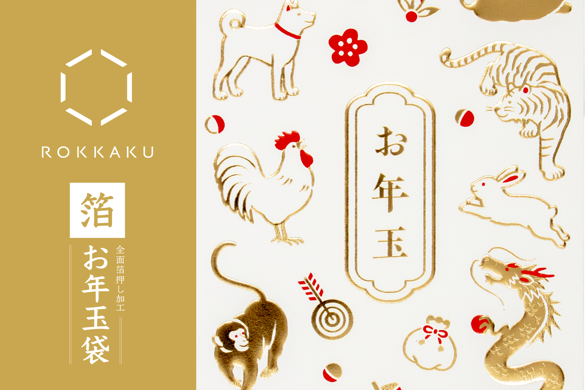 【新商品】箔押しブランド「ROKKAKU」の熟練された箔押し加工による『箔お年玉袋 めでた干支』を販売開始します