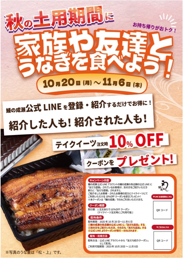 10月20日~11月6日の土用期間限定10%値引きテイクアウトキャンペーンを実施いたします
