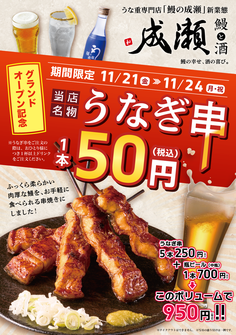 11月21日から4日間限定でうなぎ串50円キャンペーンを実施いたします