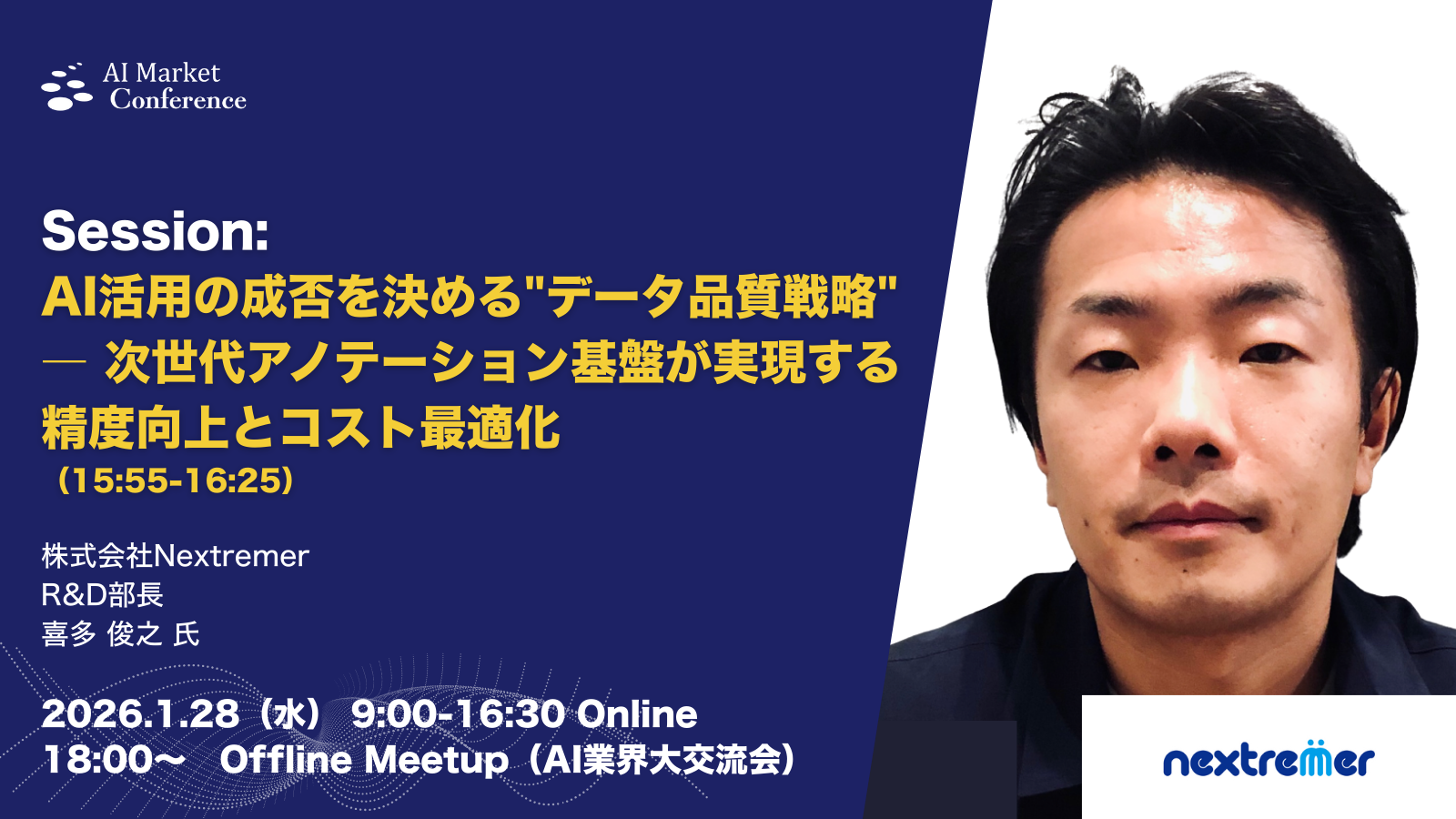 【登壇情報】Nextremer社による「AI活用の成否を決める"データ品質戦略"― 次世代アノテーション基盤が実現する精度向上とコスト最適化」|1.28|AI Market Conference