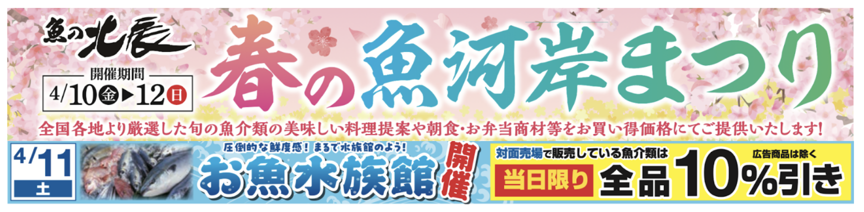 魚の北辰、全店共通「春の魚河岸祭り」を開催!魚の魅力を五感で楽しむ水族館のような演出の「お魚水族館(R)️」も4月11日に開催!対面売場の魚介類は当日限り全品10%引き