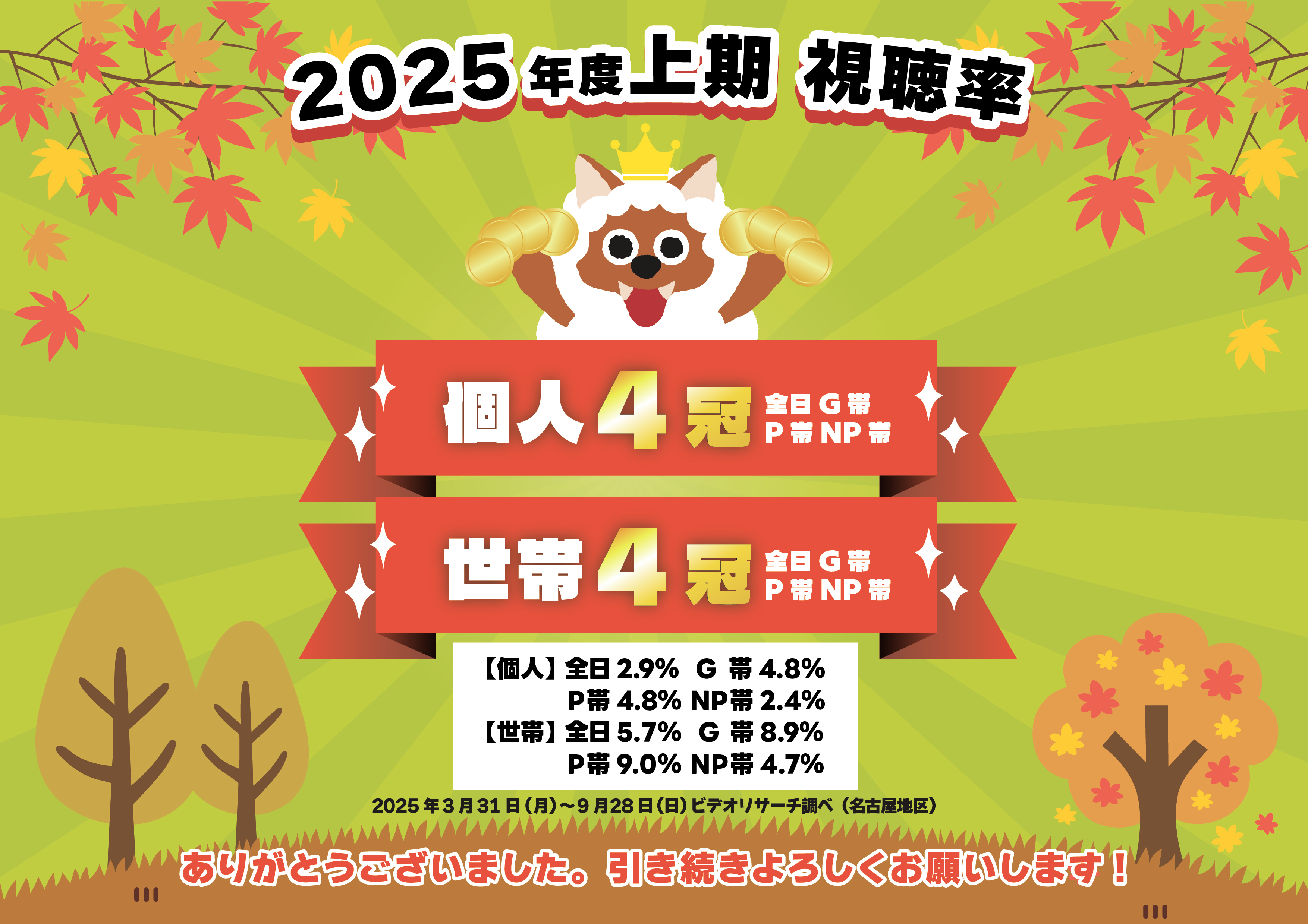 おかげさまでメ~テレは、2025年度上期平均視聴率 個人全体、世帯ともに全日・ゴールデン・プライム・ノンプライム帯「4冠」 を獲得!