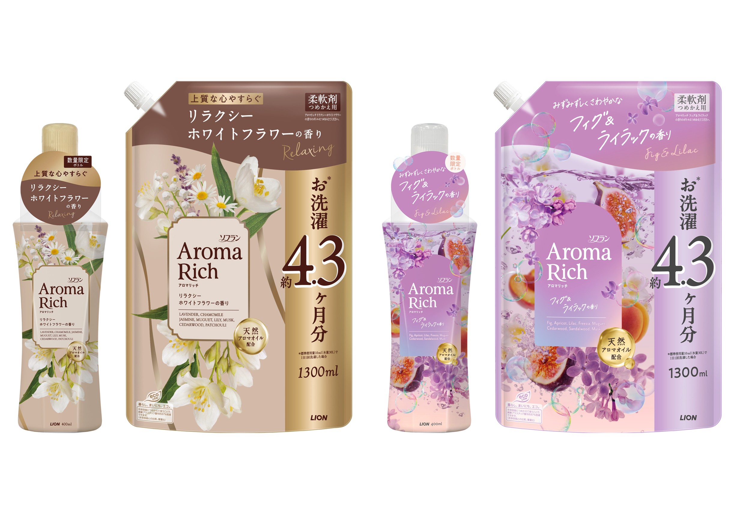 柔軟剤『ソフラン アロマリッチ』から、上質な心やすらぐ「リラクシーホワイトフラワーの香り」とみずみずしくさわやかな「フィグ&ライラックの香り」を新発売