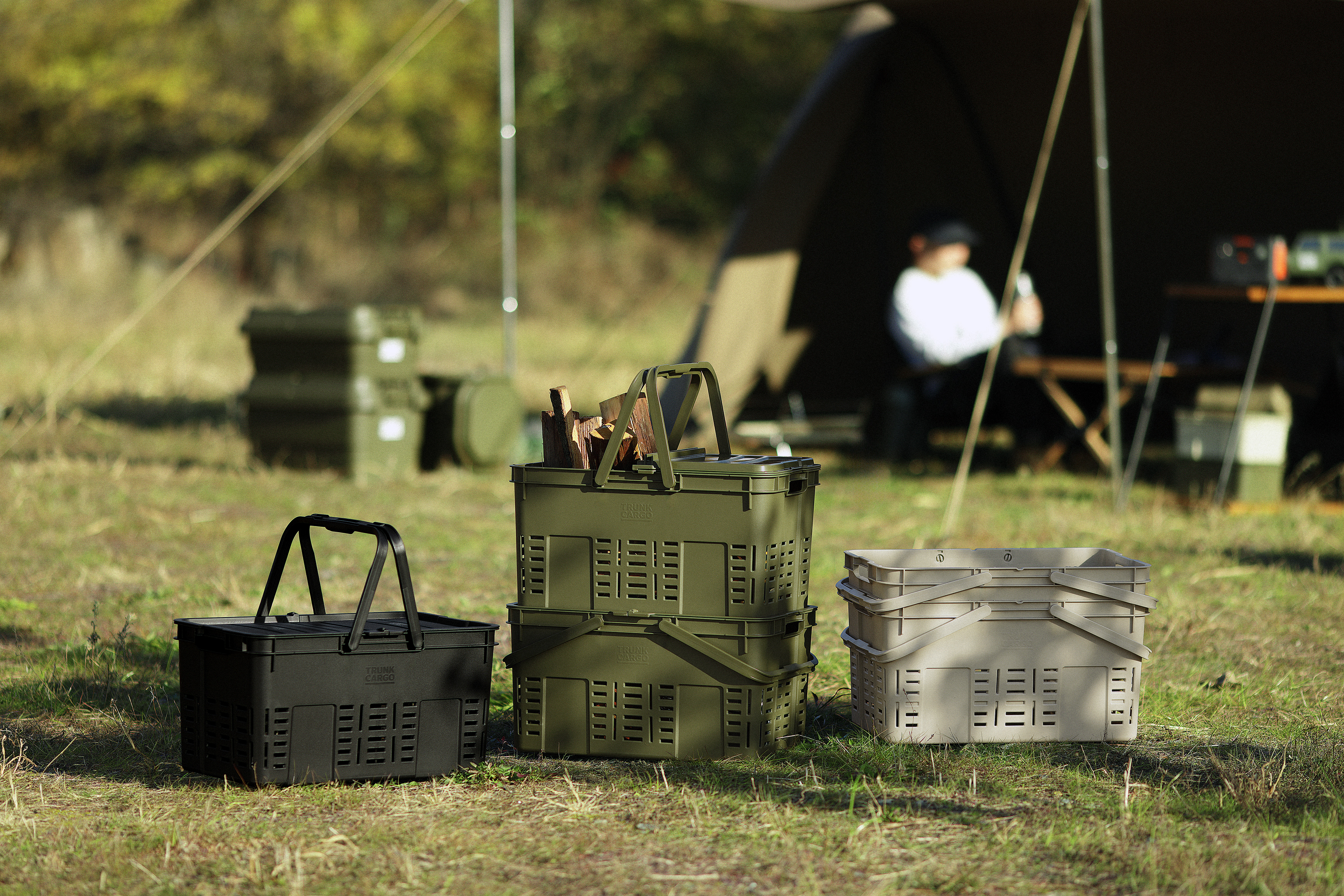 アウトドア収納として人気の「トランクカーゴ」から片手で持ち運べるバスケットタイプの収納容器「メッシュカーゴ36」が新登場。