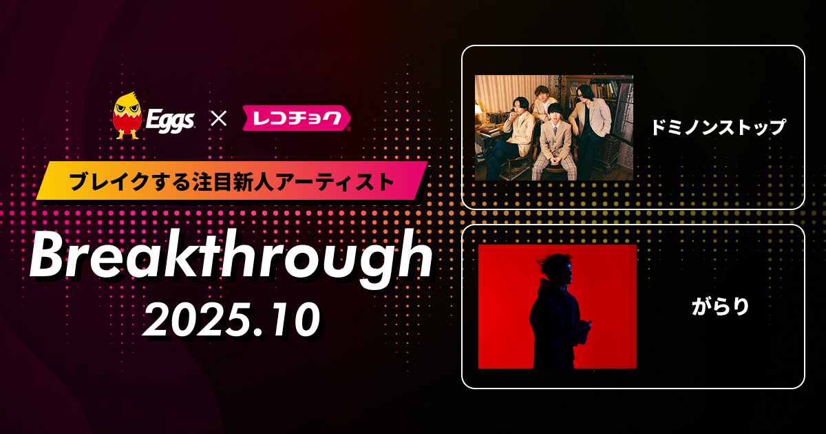 レコチョクが“ブレイクする注目新人アーティスト” 「Breakthrough」を発表!2025年10月は「がらり」とEggsで注目の「ドミノンストップ」