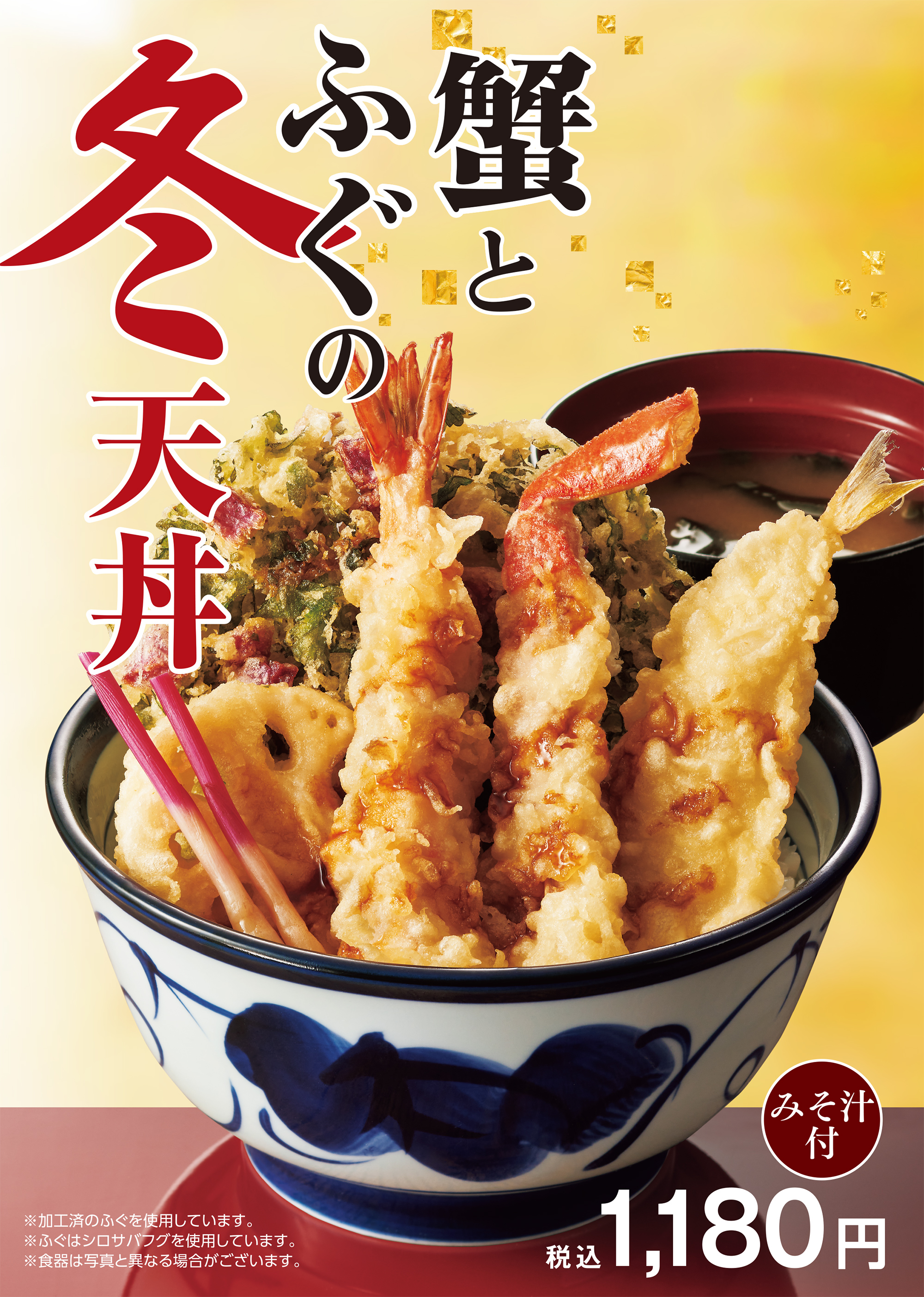 天丼てんやの冬限定メニュー11月13日(木)より販売開始。冬の食材の”ごちそう感”が魅力の『蟹とふぐの冬天丼』てんやの麺シリーズ第5弾『小柱とやわとろ葱のかき揚げそば』や『冬の吟醸酒セット』も初登場