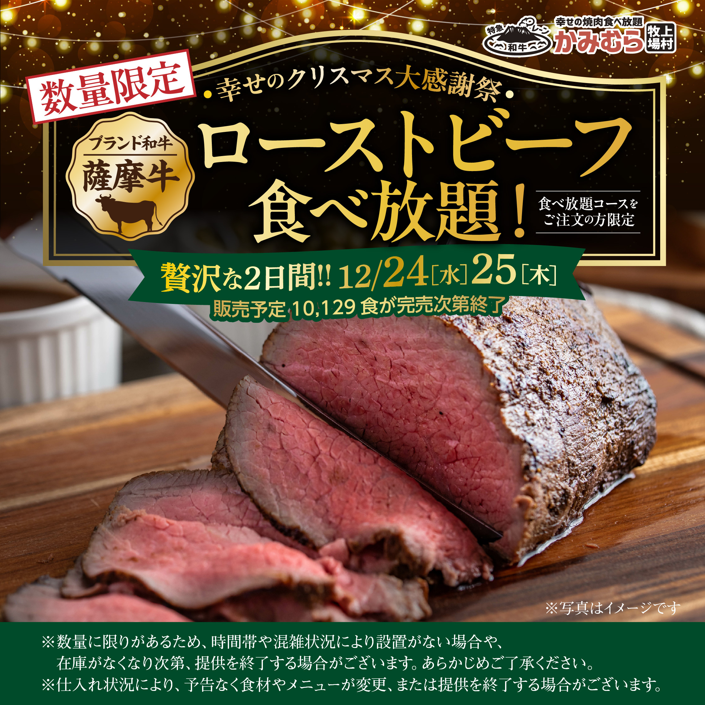 【かみむら牧場】幸せのクリスマス大感謝祭!2日間限定「薩摩牛ローストビーフ食べ放題」開催 ~食べ放題コースに“薩摩牛ローストビーフ”が追加で楽しめる~