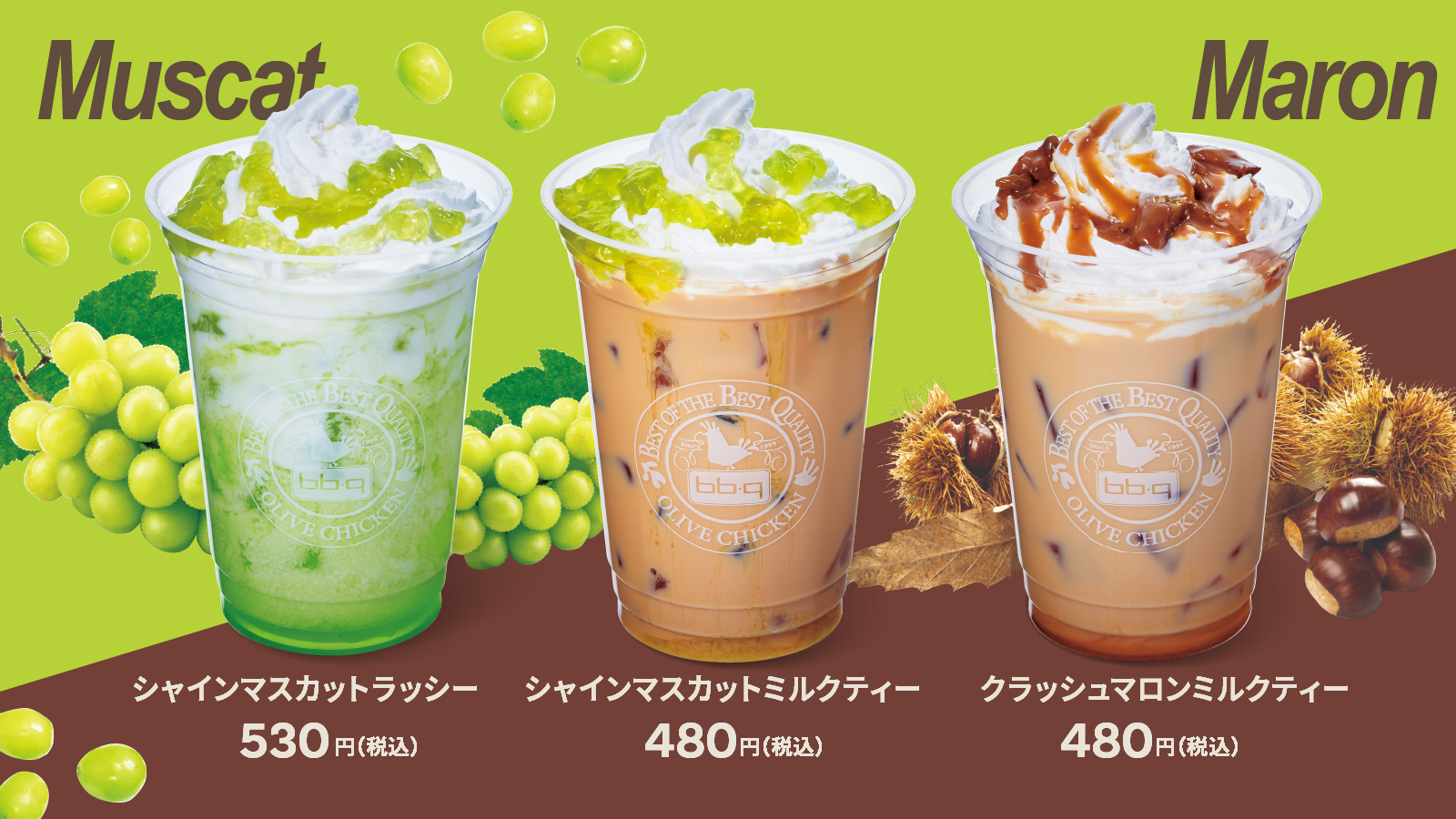 【bb.q オリーブチキン】秋の味覚をお届け♪爽やかなシャインマスカットとほっくり甘いマロンを楽しむ季節限定ドリンク「マスカット&マロン」シリーズ9月11日(木)より新登場!