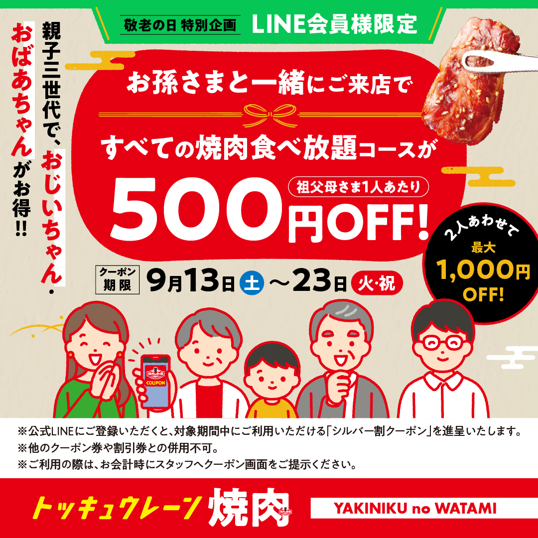 【焼肉の和民】敬老の日特別企画!シルバーウィーク限定「親子三世代割」実施 ~おじいちゃん・おばあちゃんと一緒に焼肉を楽しもう!~