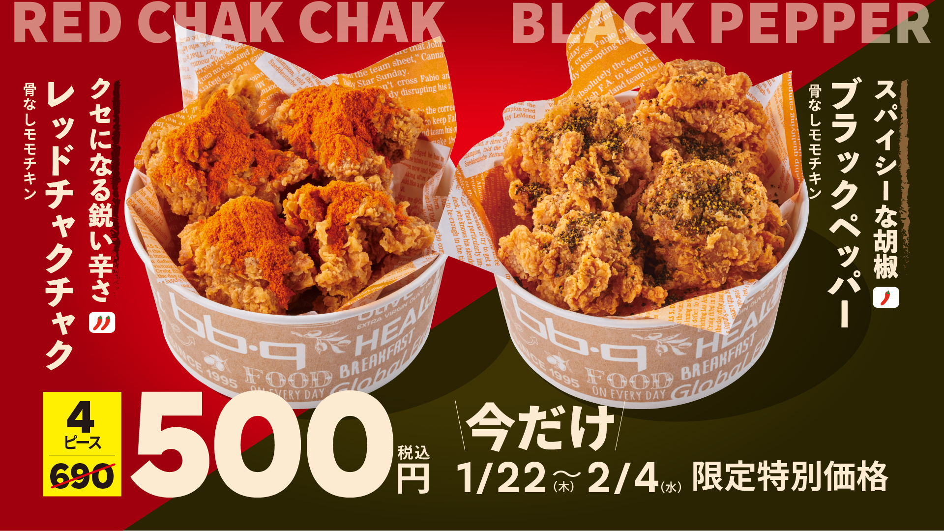 【bb.q オリーブチキン】刺激、選べる。クセになる鋭い辛さの「レッドチャクチャク」とスパイシーな胡椒が香る「ブラックペッパー」骨なしモモチキンが今だけ4ピース500円(税込)