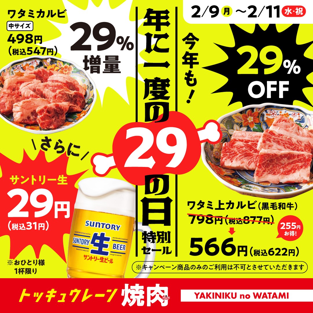 【焼肉の和民】ビール1杯29円の衝撃!自慢のワタミカルビが29%増量!ワタミ上カルビが29%オフ!2月9日から3日間限定!年に一度の肉の日特別セールを開催します!!