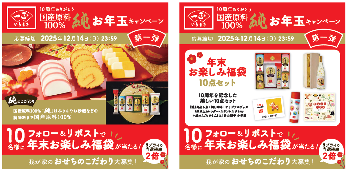 感謝の10周年プレゼント企画!新年に大切な人と味わいたいおせち 国産原料100%『純』シリーズや、いちまさ(一正蒲鉾)オリジナルグッズを合計110名さまに!