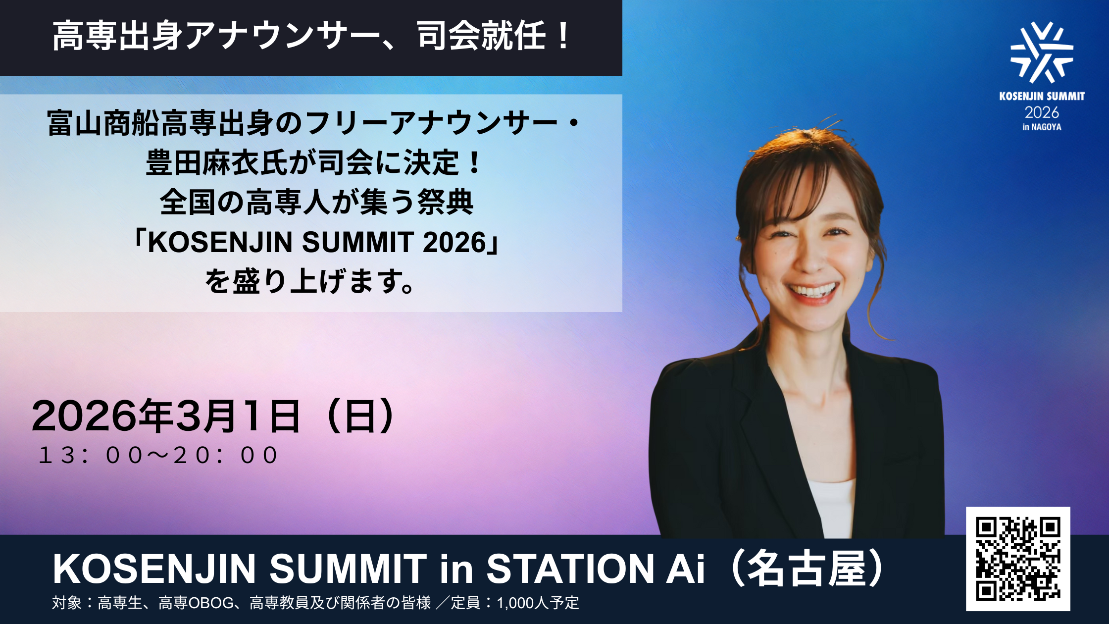 【高専人会】富山商船高専出身のフリーアナウンサー・豊田麻衣氏が司会に決定!全国の高専人が集う祭典「KOSENJIN SUMMIT 2026」を盛り上げます。【3月1日名古屋開催】
