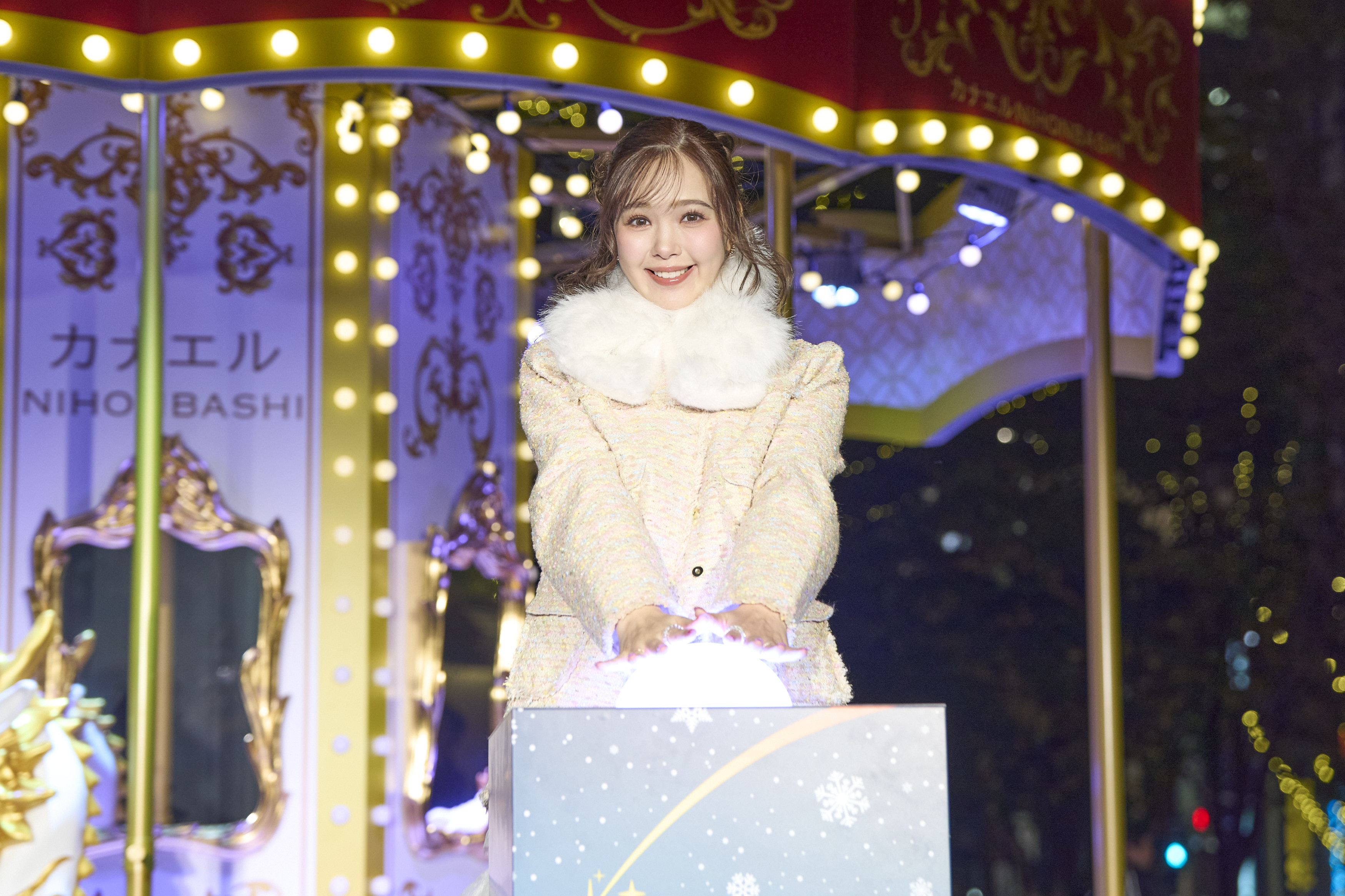 藤田ニコルさんがメインシンボルの点灯式に登場!日本橋ならではの幸福を呼ぶ“麒麟ゴーラウンド”が点灯