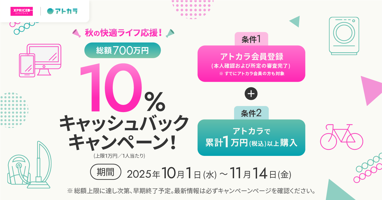 あと払いサービスの「アトカラ」 家電EC「XPRICE本店」にて10%キャッシュバックキャンペーンを実施!