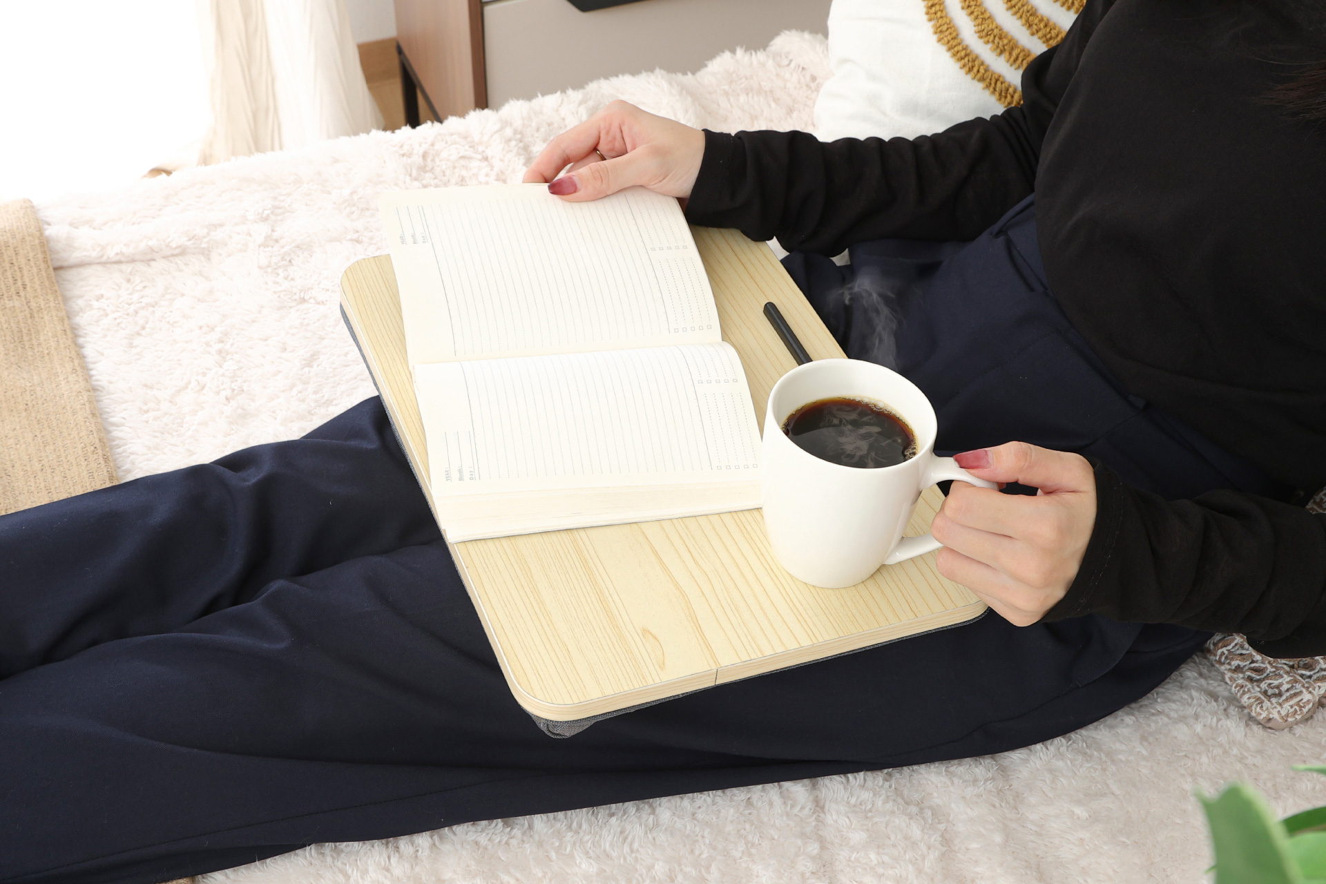 累計出荷額1億円突破シリーズの最新作!「どこでも使える膝上テーブル」登場。車内でのランチや、机のない場所での会議もサッと快適に。
