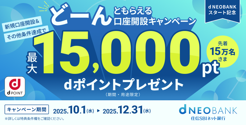 住信SBIネット銀行、「d NEOBANK」スタート記念 dポイントどーんともらえる口座開設キャンペーン実施のお知らせ