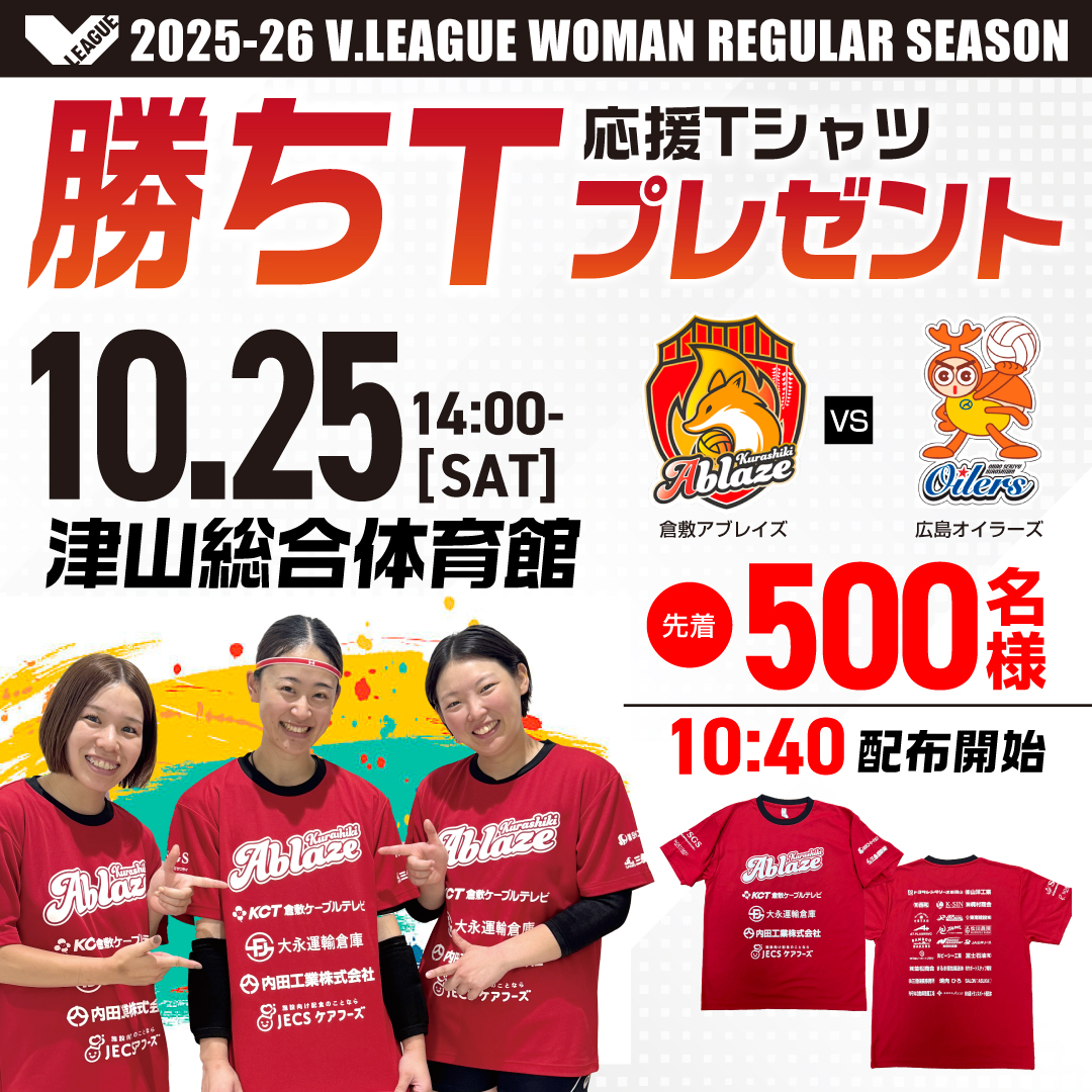 倉敷アブレイズ、いよいよホーム開幕!津山総合体育館を真っ赤に染めよう! 勝ちT配布・市民招待・サイン会など来場特典も充実!