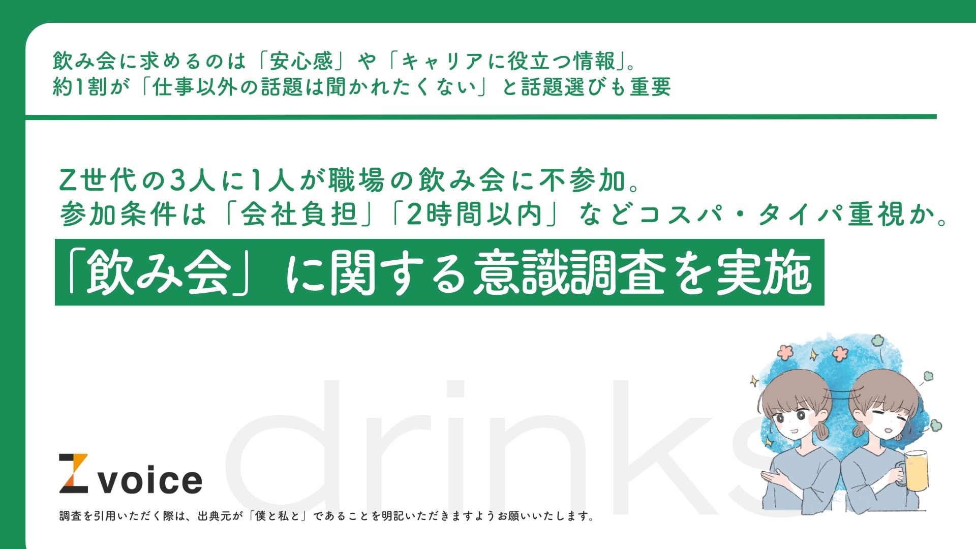 Z世代の3人に1人が職場の飲み会に不参加。参加条件は「会社負担」「2時間以内」などコスパ・タイパ重視か。「飲み会」に関する意識調査を実施PR TIMES トレンド