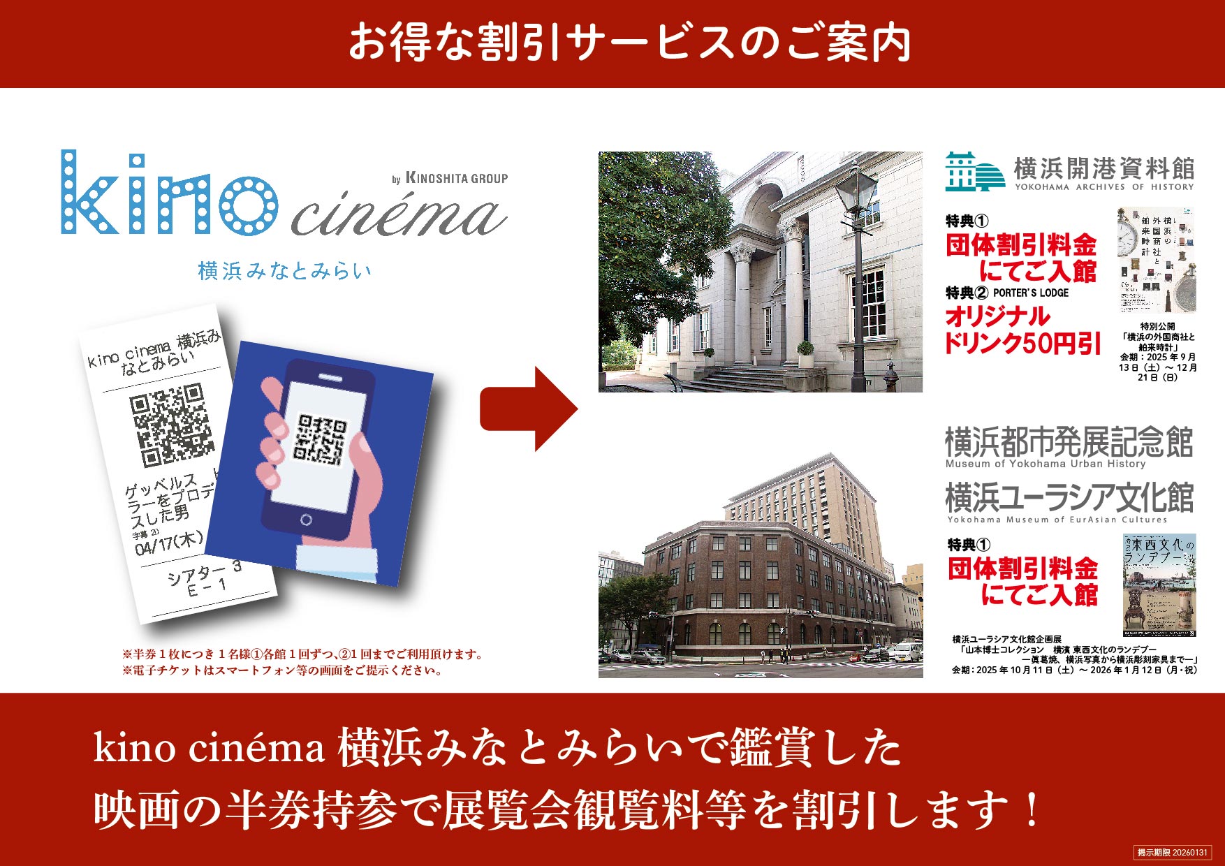 kino cinema横浜みなとみらいと連携割引を実施します【横浜開港資料館・横浜都市発展記念館・横浜ユーラシア文化館】