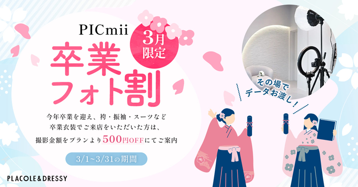 セルフ写真館『PICmii』PLACOLE&DRESSY プロデュースの横浜店・名古屋店・大阪店にて3月限定『卒業フォト割』実施決定!