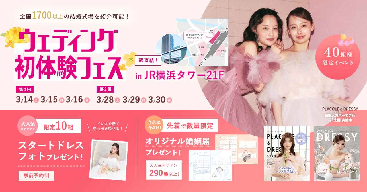 【個室で安心の相談体験】3/14(土)~3/16(月)結婚準備を楽しく進めるウェディング初体験フェス開催決定 in DRESSY ROOM YOKOHAMA(横浜駅直結)