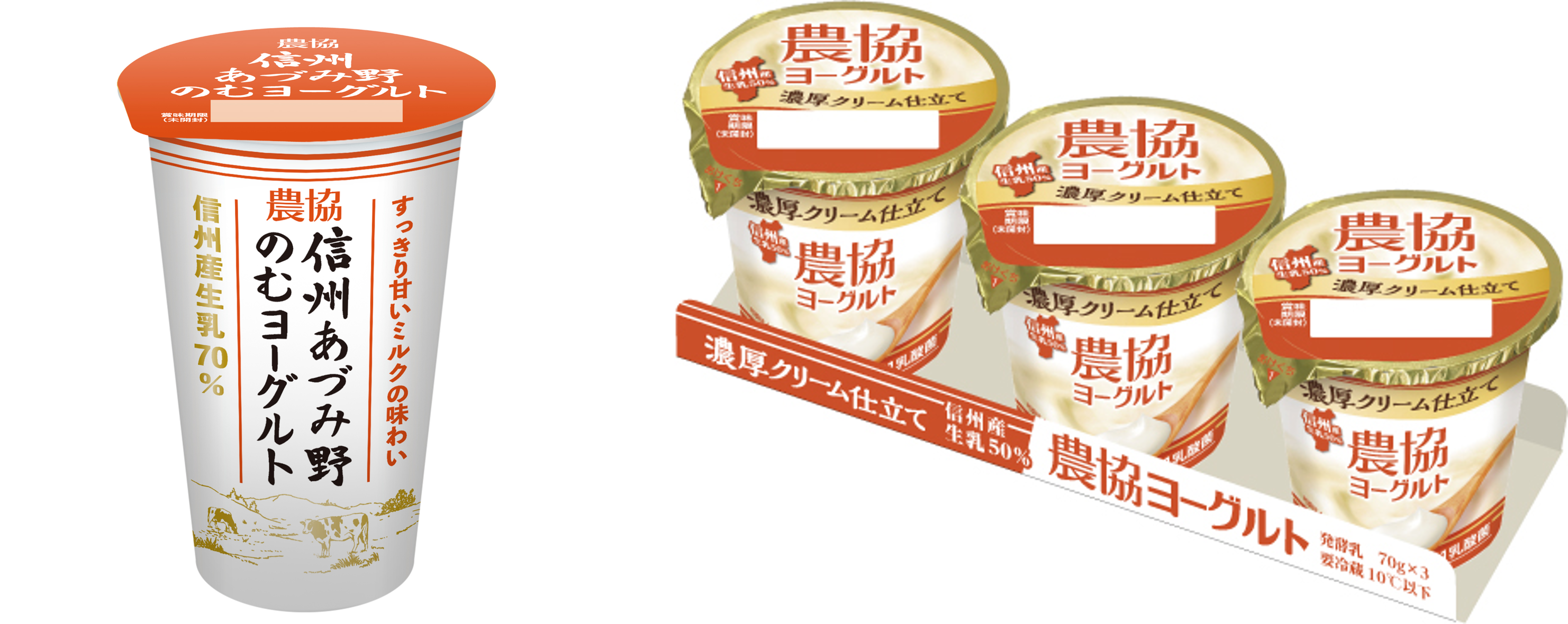 信州産生乳と国産生クリーム使用! 素材のおいしさを大切にした農協シリーズ新商品! 『農協 信州あづみ野のむヨーグルト』『農協ヨーグルト濃厚クリーム仕立て70g×3個』