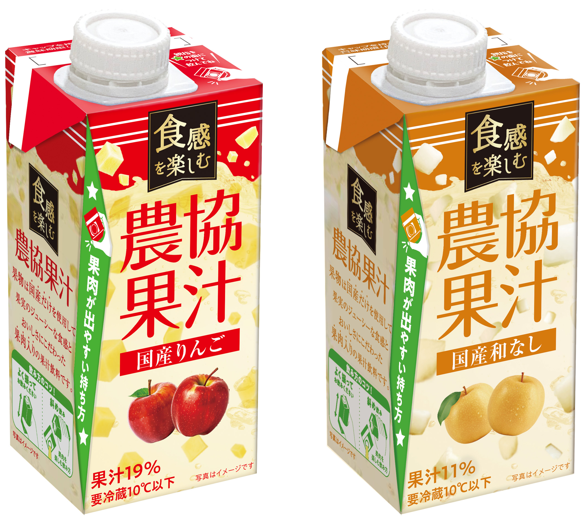 果肉の食感が楽しめる国産果汁飲料! こだわりの容器で果肉と果汁の一体感のある食感が楽しめる! 『食感を楽しむ農協果汁 国産りんご』『食感を楽しむ農協果汁 国産和なし』