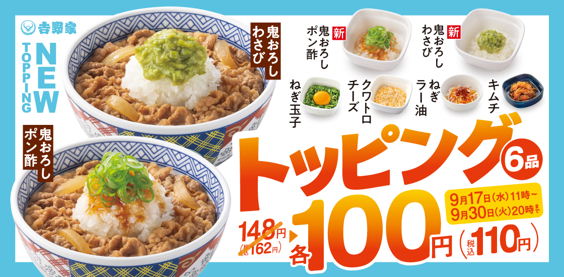 吉野家 人気&新登場トッピング6種が期間限定100円になるトッピング祭!本日より開始