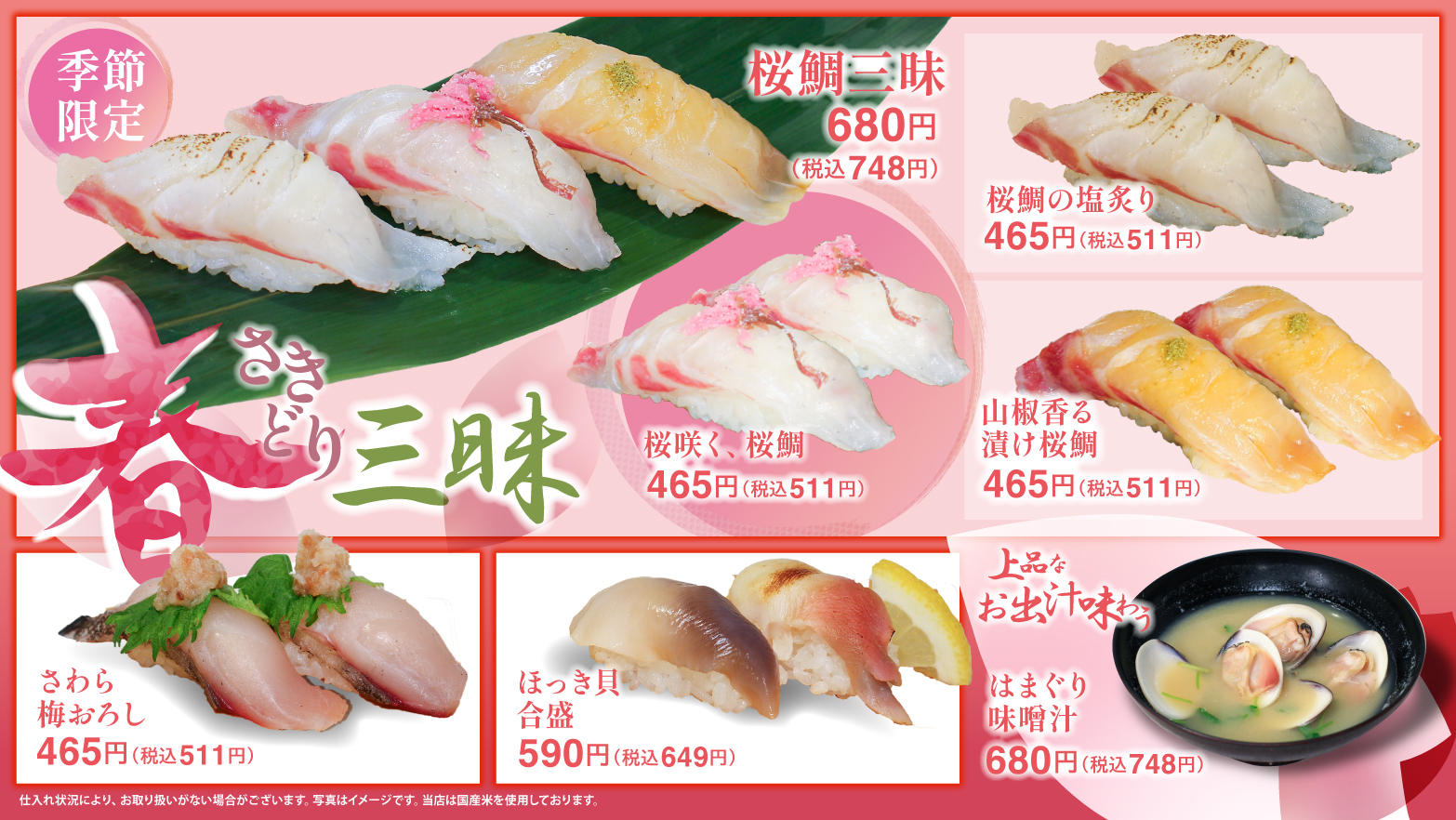ハル色香るフェア―“春さきどり三昧”―が、3月3日よりスタート!上品な《春の桜鯛》を、日本が誇る廻転寿司という「食」エンターテインメントでお楽しみください!