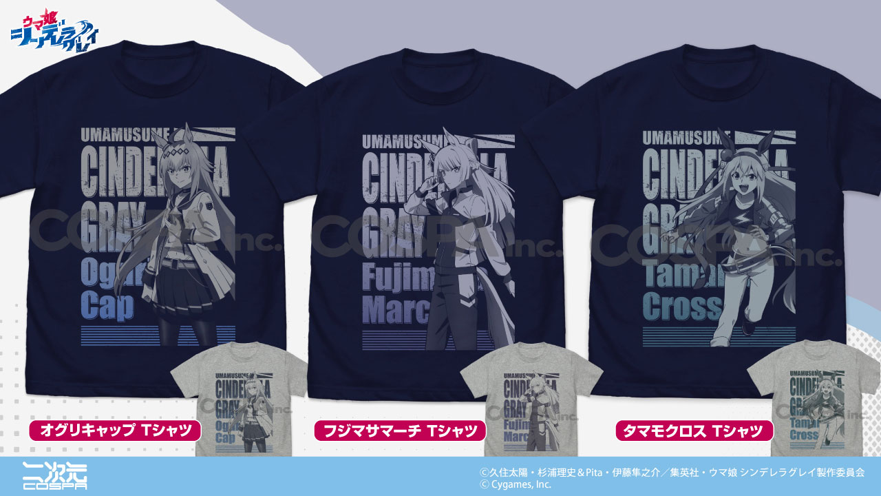 アニメ『ウマ娘 シンデレラグレイ』新グッズ、オグリキャップ、フジマサマーチ、タマモクロスの「Tシャツ」が二次元コスパから登場!【株式会社コスパ】