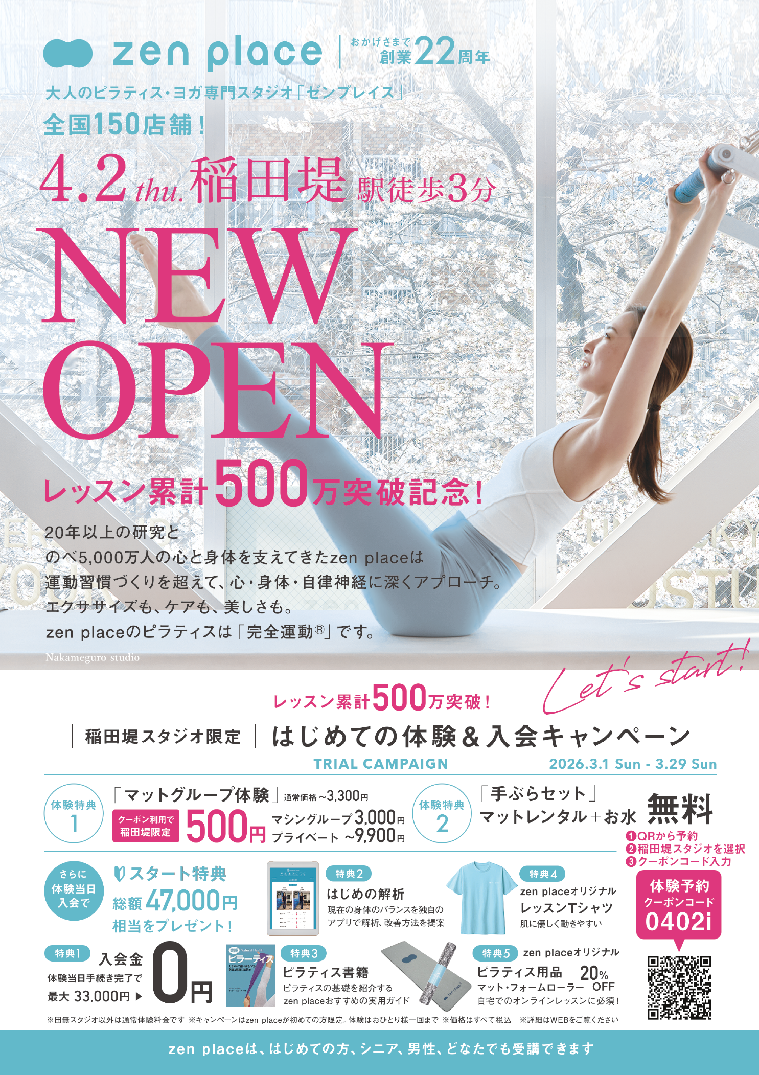 【2026年4月2日(木)新店オープン】国内150店舗のzen placeピラティス・ヨガスタジオ「zen place pilates 稲田堤スタジオ」がオープン!