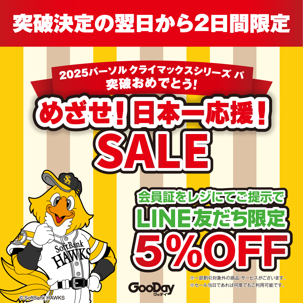祝!2025パーソル パ・リーグ優勝!福岡ソフトバンクホークス 優勝おめでとうセール 明日9月28日(日)1日限定開催
