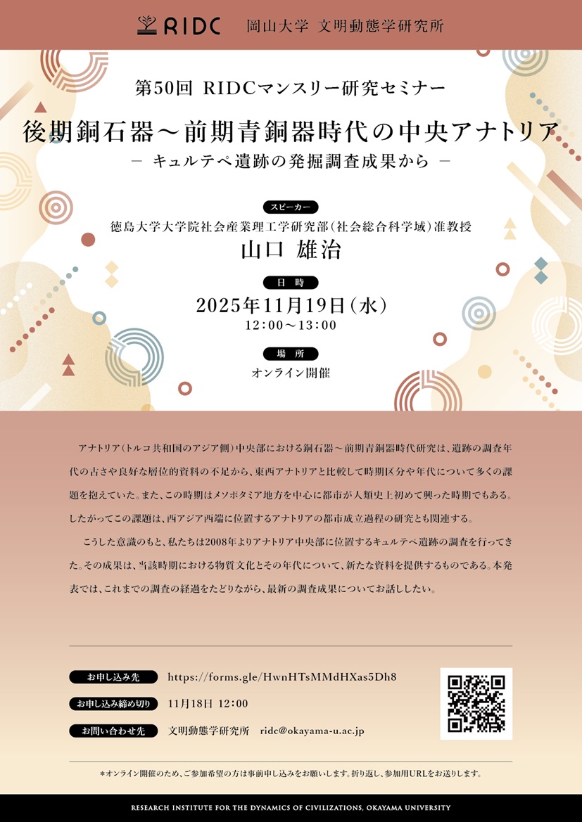 【岡山大学】高等先鋭研究院 文明動態学研究所 第50回RIDCマンスリー研究セミナー「後期銅石器~前期青銅器時代の中央アナトリア-キュルテペ遺跡の発掘調査成果から-」〔11/19,水 オンライン開催〕