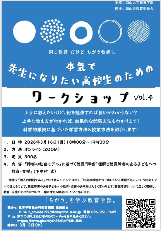 【岡山大学】第4回 先生になりたい高校生のためのワークショップ〔3/16,月 オンライン開催〕