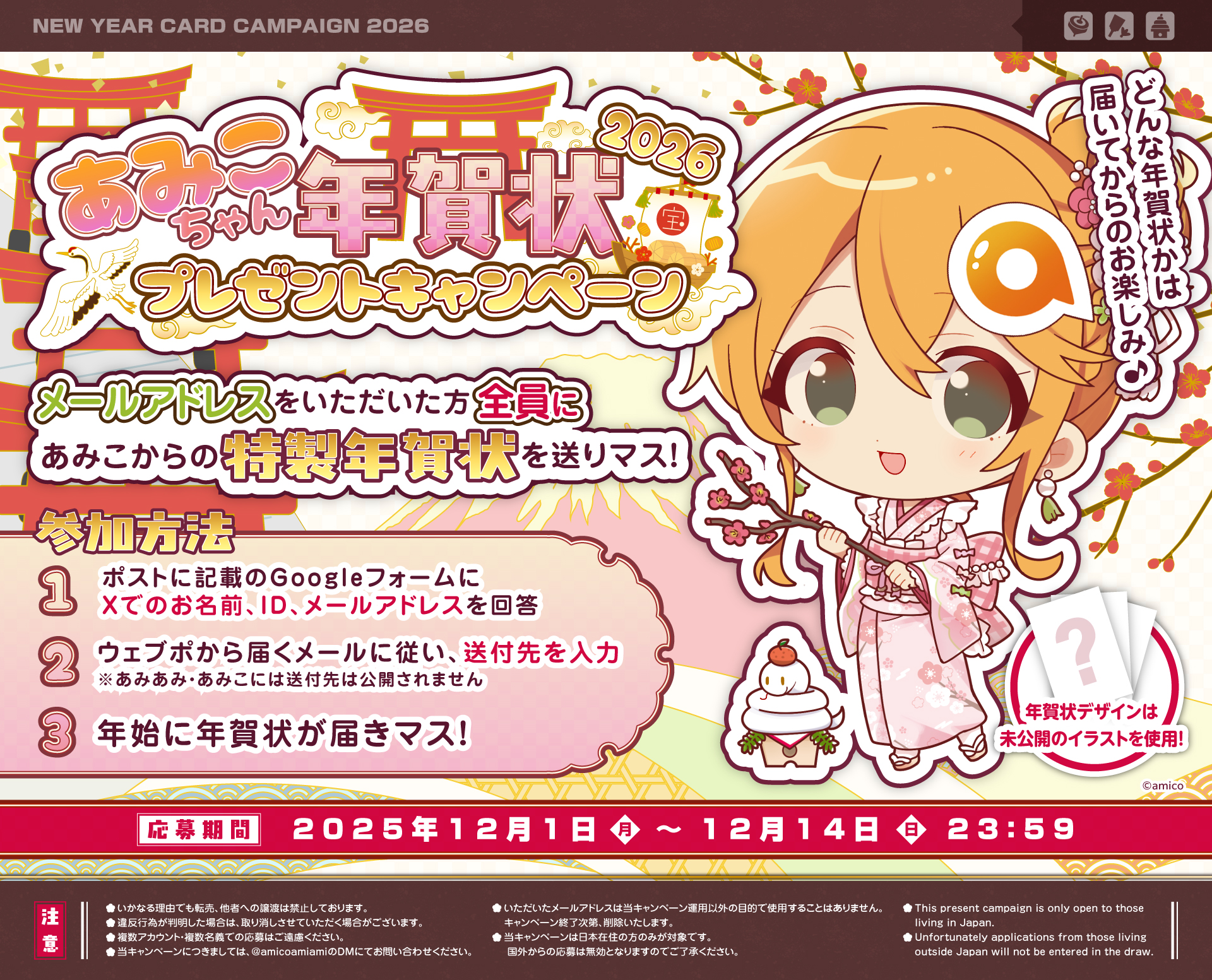 「あみこちゃん年賀状プレゼントキャンペーン2026」がX(旧Twitter)で今年も開催。