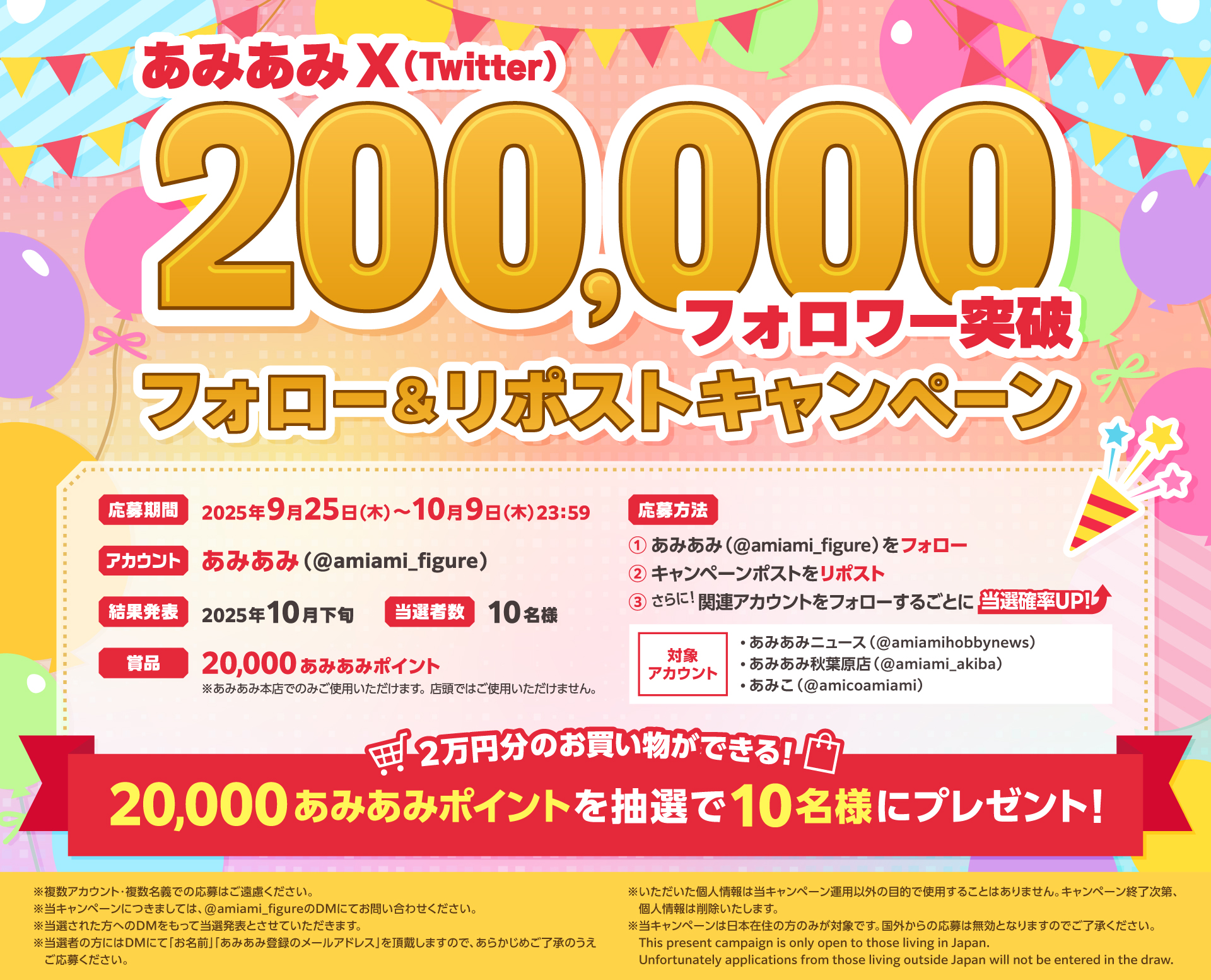 『あみあみ』X(Twitter)フォロワー20万人突破!2万円分のお買い物ができる「20,000あみあみポイント」を抽選でプレゼント。