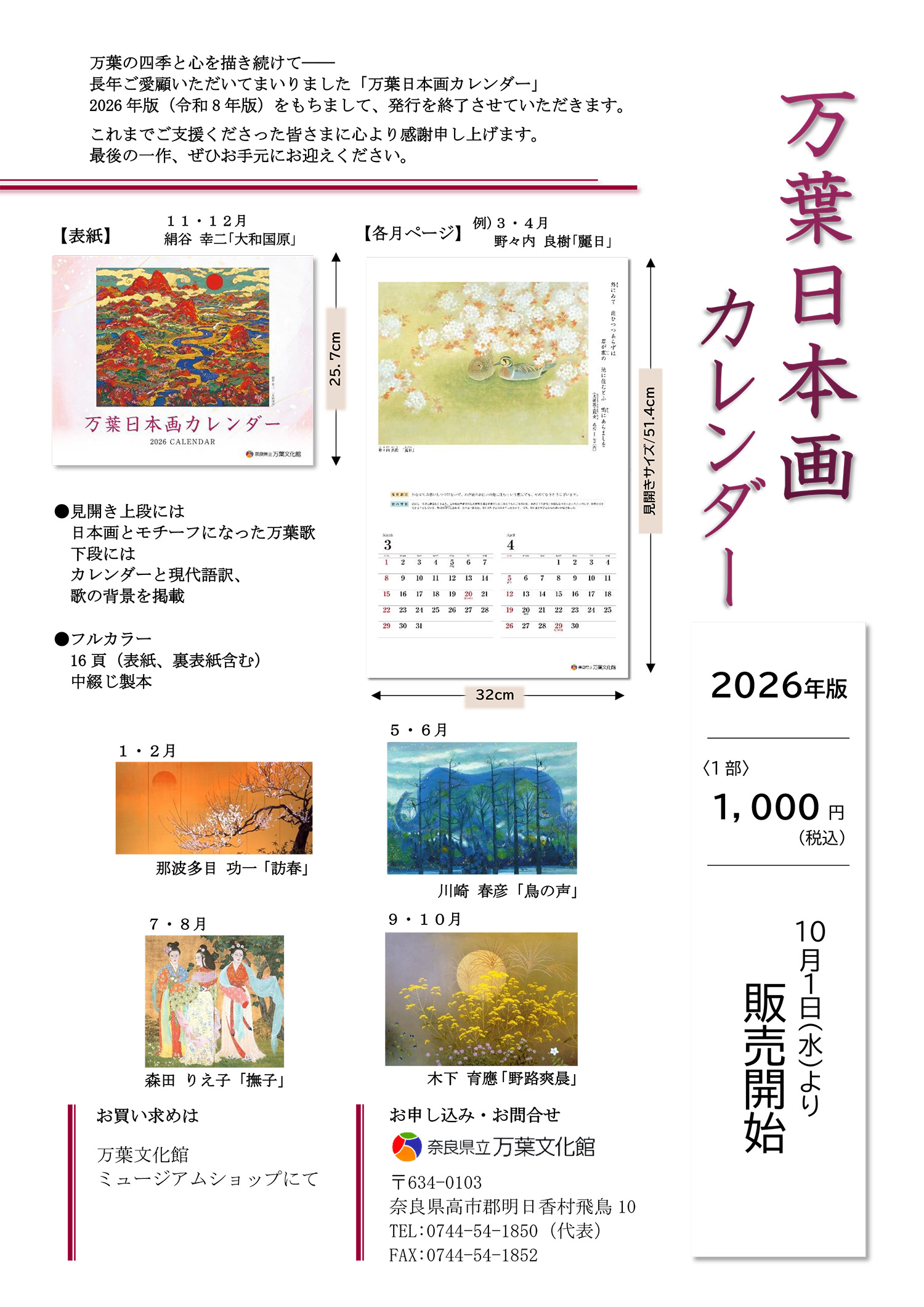 【奈良県立万葉文化館】オリジナル万葉日本画カレンダーができました