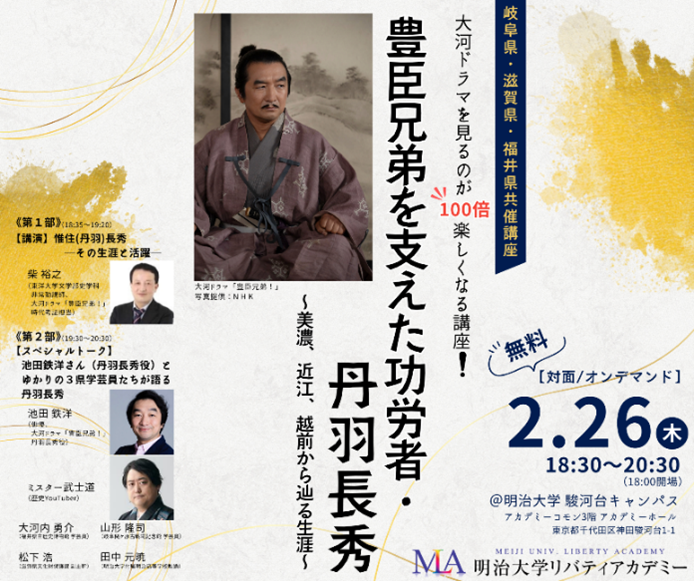 無料公開講座「豊臣兄弟を支えた功労者・丹羽長秀 ~美濃、近江、越前から辿る生涯~《岐阜県・滋賀県・福井県共催講座》」を明治大学リバティアカデミーが2月26日(木)に開催