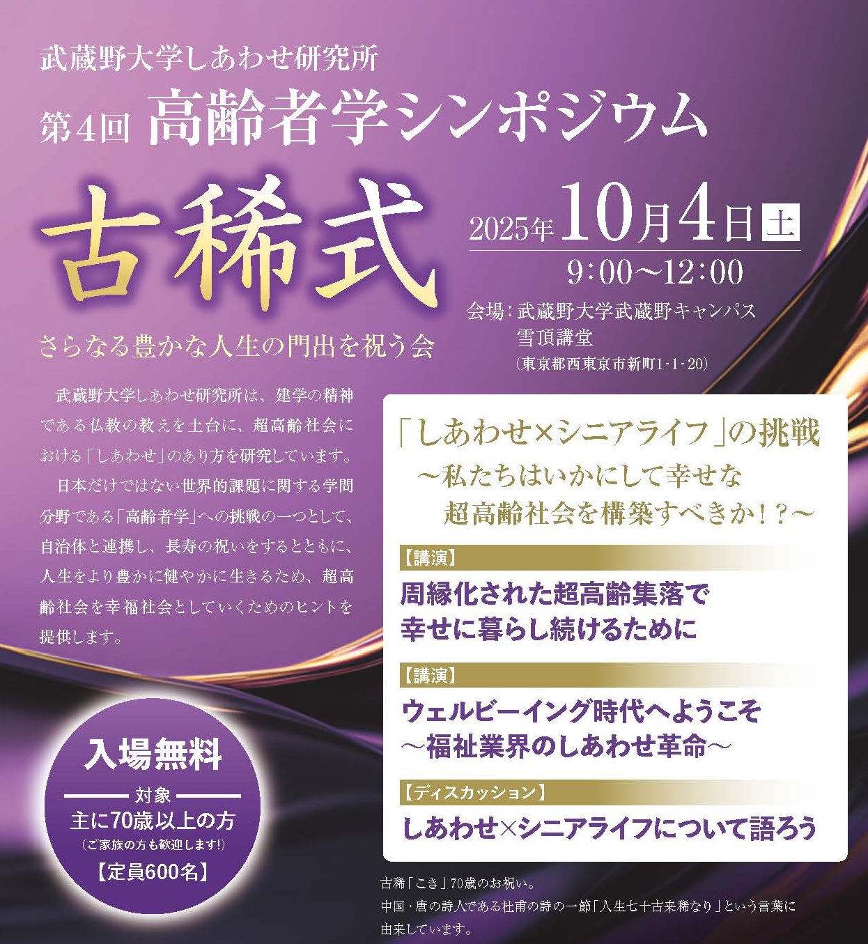 【武蔵野大学】「社会福祉学」「ウェルビーイング」の専門家等、5名の大学教員が基調講演、対談を実施 第4回 高齢者学シンポジウム「古稀式」を10月4日(土)に武蔵野キャンパスで開催!