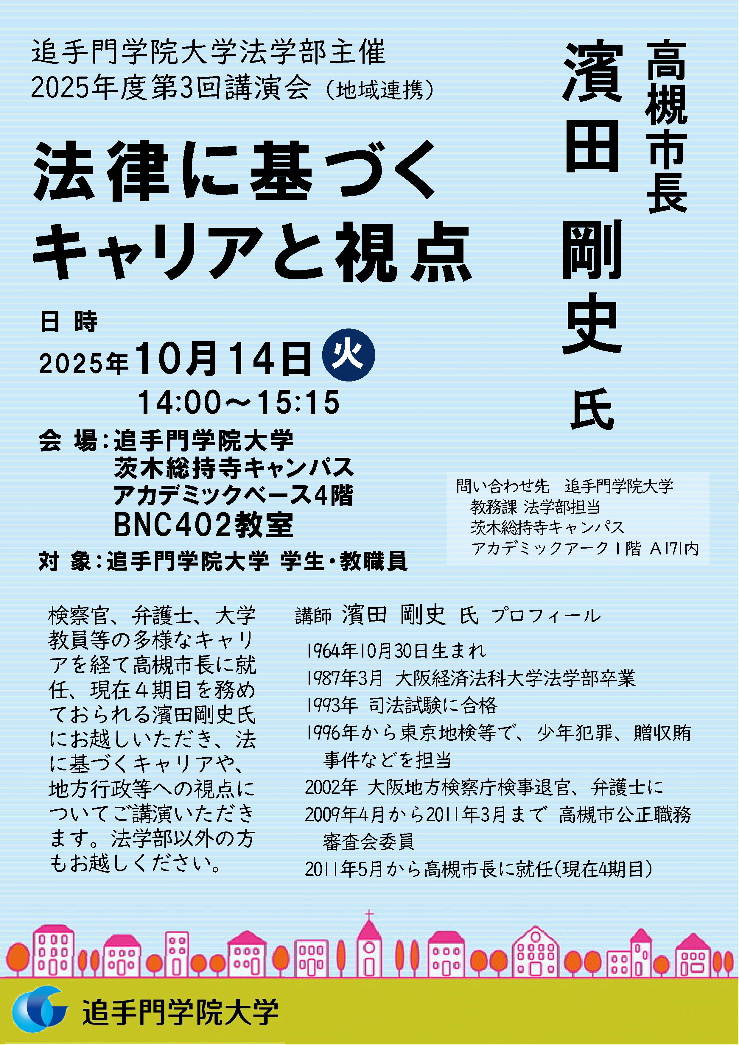 濱田剛史高槻市長が追大法学部で講演。法学を生かしたキャリアと自治体行政の現場から学ぶ