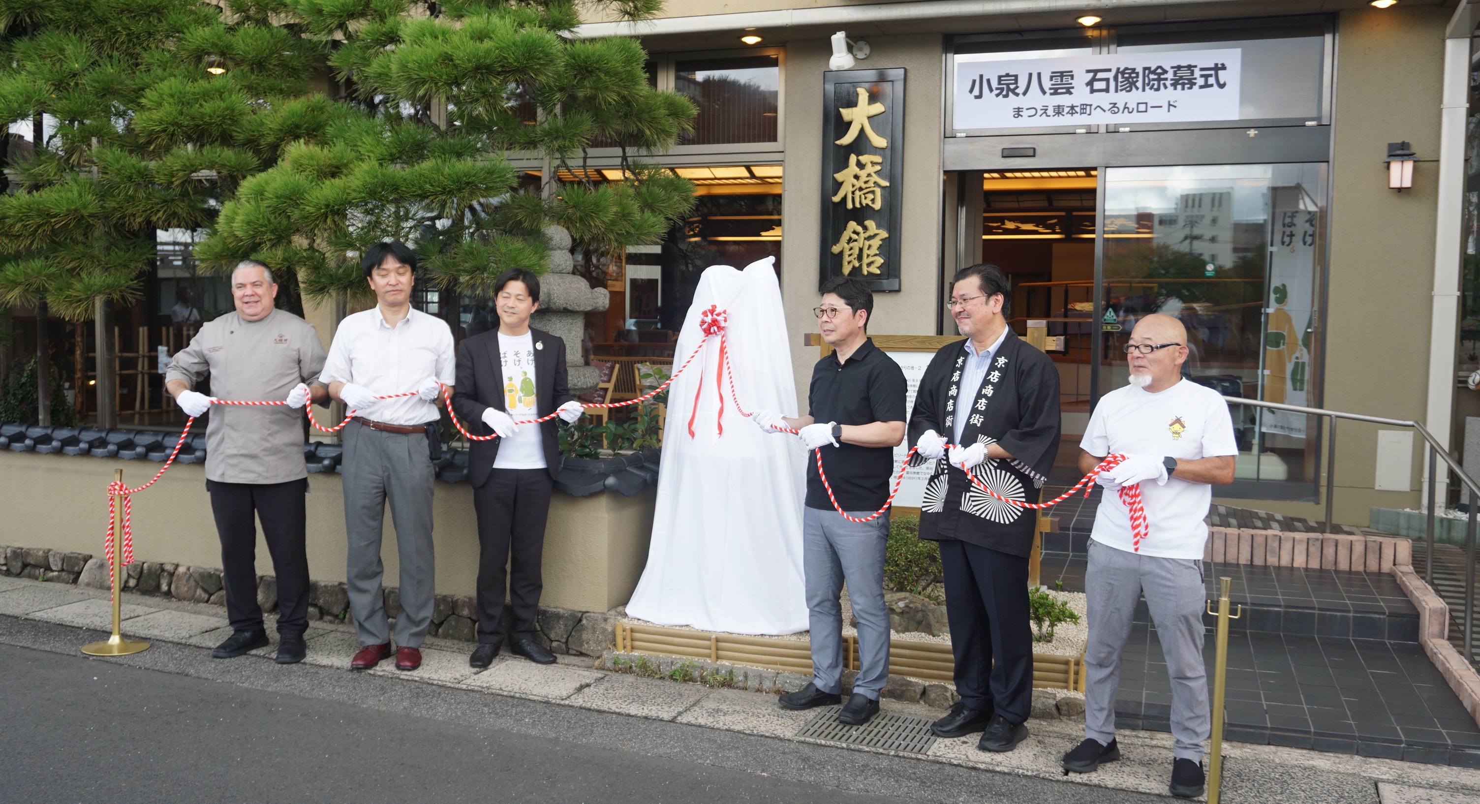 島根電工、小泉八雲の石像を寄贈。さらに完成を記念する除幕式に、「曳綱役」として参加