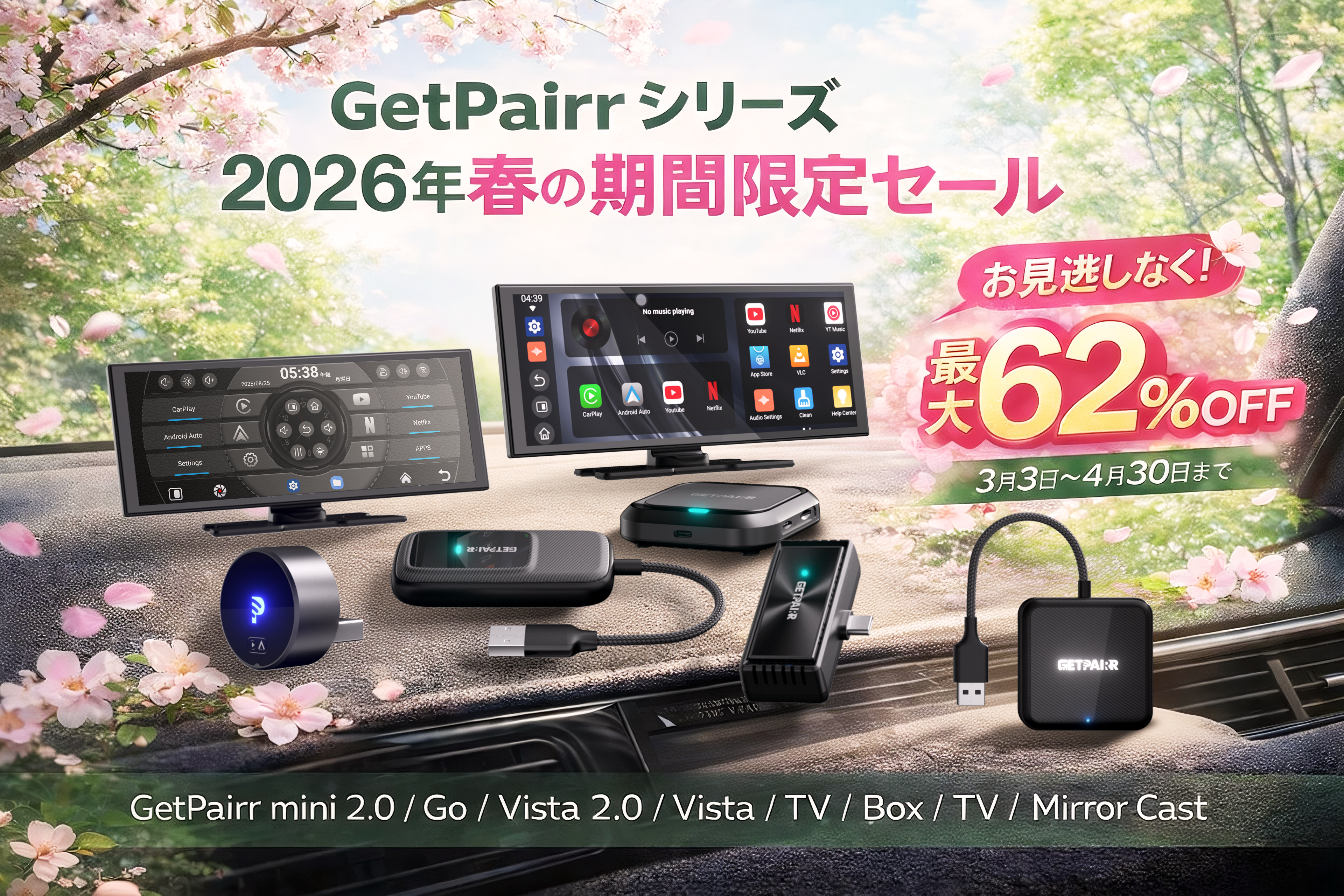春のドライブをもっと快適に!CarPlay無線化・ミラーリング・Androidディスプレイまで、車内体験をアップグレードするGetPairrシリーズ主要モデルが一斉値下げ!最安2,980円から購入可能